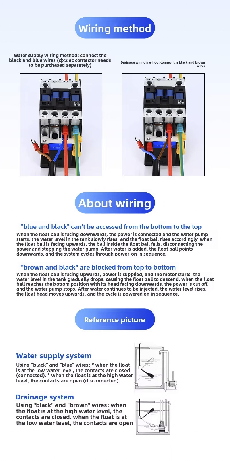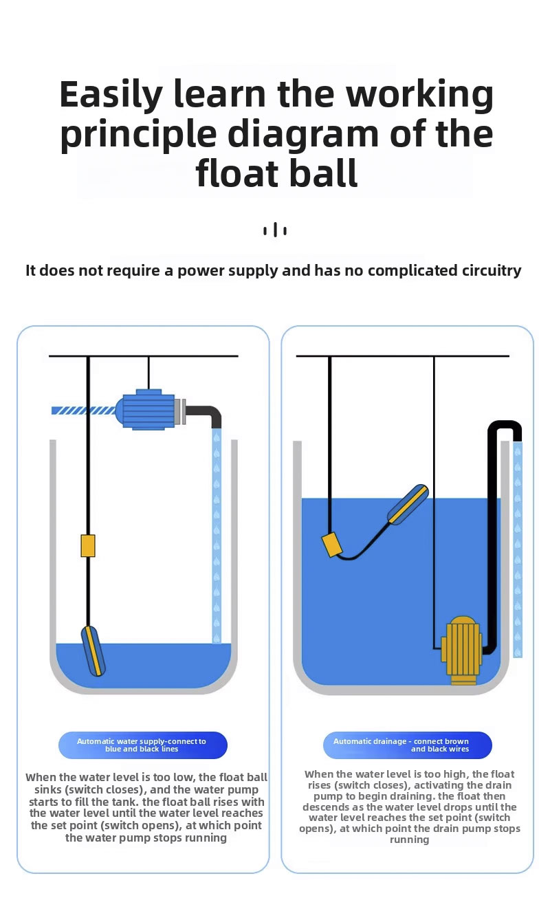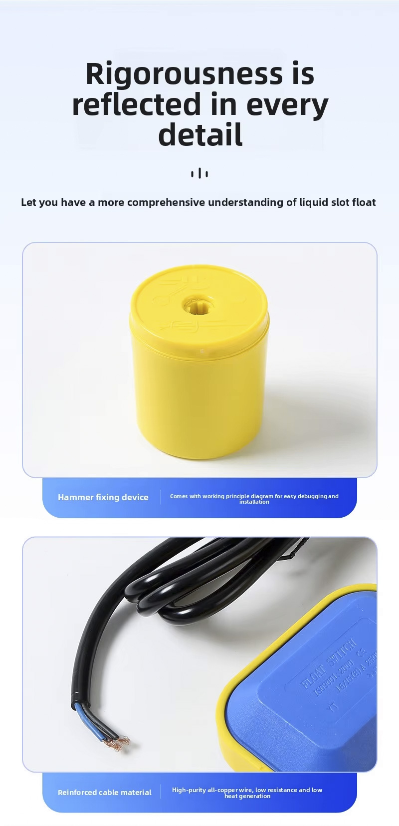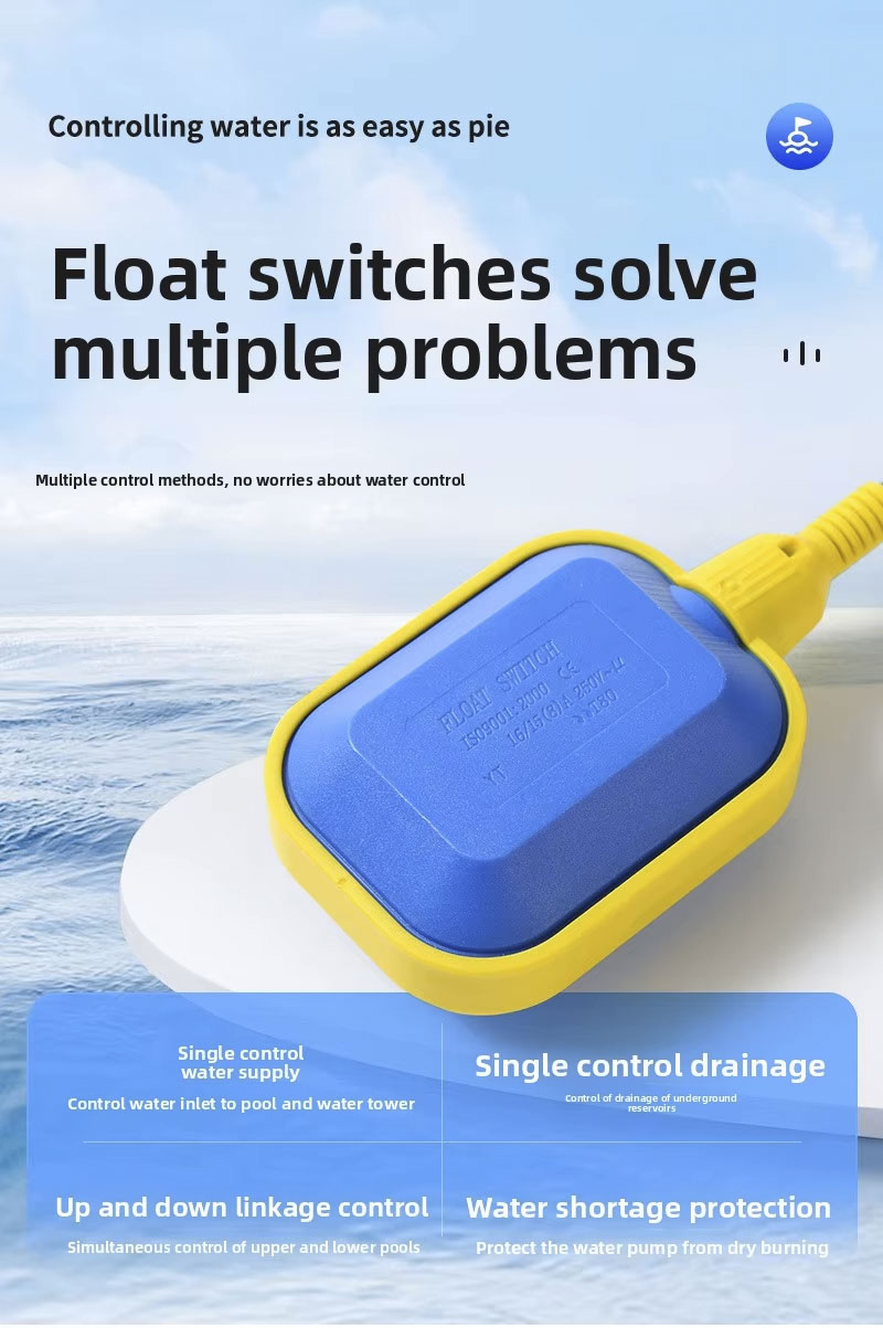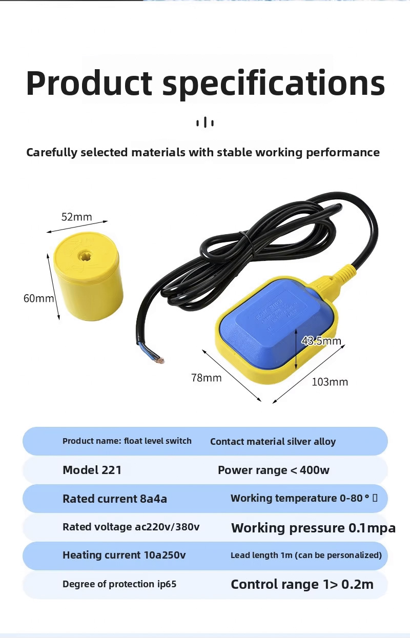 Tässä kelluvassa kytkimessä on suuri pyöreä muotoilu, 2m, 3m, 5m, 10m, IP68-suojausluokka, ja se toimii lämpötiloissa 0 ℃ - 80 ℃. Se tukee laajaa jännitealuetta 110 V - 220 V, ja sen kestävä työpaine on ±0,5 M laserpainattavissa. Tuote on räätälöitävissä. tai OEM/ODM-palvelut, jotka varmistavat sopeuttavuuden erilaisiin sovelluksiin.
