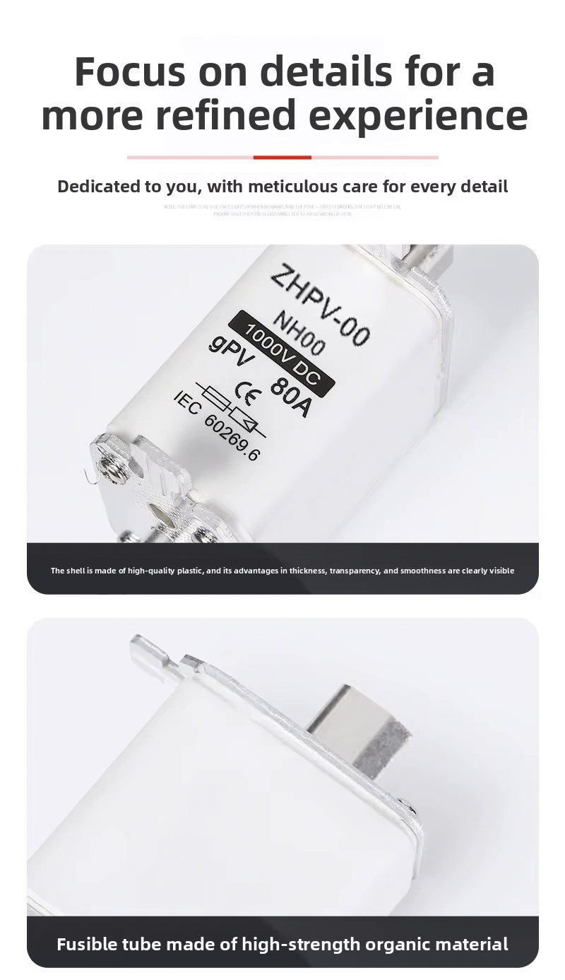 NH00-1000V IEC-pienjännitteinen aurinkosähköveitsisulake muovinen 80A 6ka Breaking Capacity on suunniteltu tehokkaaseen ja luotettavaan virtapiirien suojaamiseen aurinkosähköjärjestelmissä ja muissa pienjännitesovelluksissa. Tämä korkealaatuinen sulake toimii 1000 V:iin asti, ja sen vankka katkaisukapasiteetti on 6ka, mikä varmistaa turvallisen irrotuksen ylikuormituksen tai oikosulkujen sattuessa. Sen 80 A nimellisvirta tekee siitä sopivan erilaisiin aurinkosähköasennuksiin ja teollisuuden ohjauspaneeleihin.