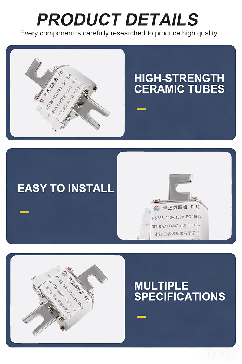 RS72B 500V 160A BC 100KA Fuse Links on korkean suorituskyvyn teollisuussulake, joka on suunniteltu erityisesti korkeajännite- ja suurvirtasuojaukseen. RS72B 500V 160A BC 100KA Fuse Links on valmistettu korkealaatuisista materiaaleista ja sillä on erinomainen katkaisukyky. Se kestää enintään 100 KA:n oikosulkuvirran, mikä estää tehokkaasti laitevaurioita.
