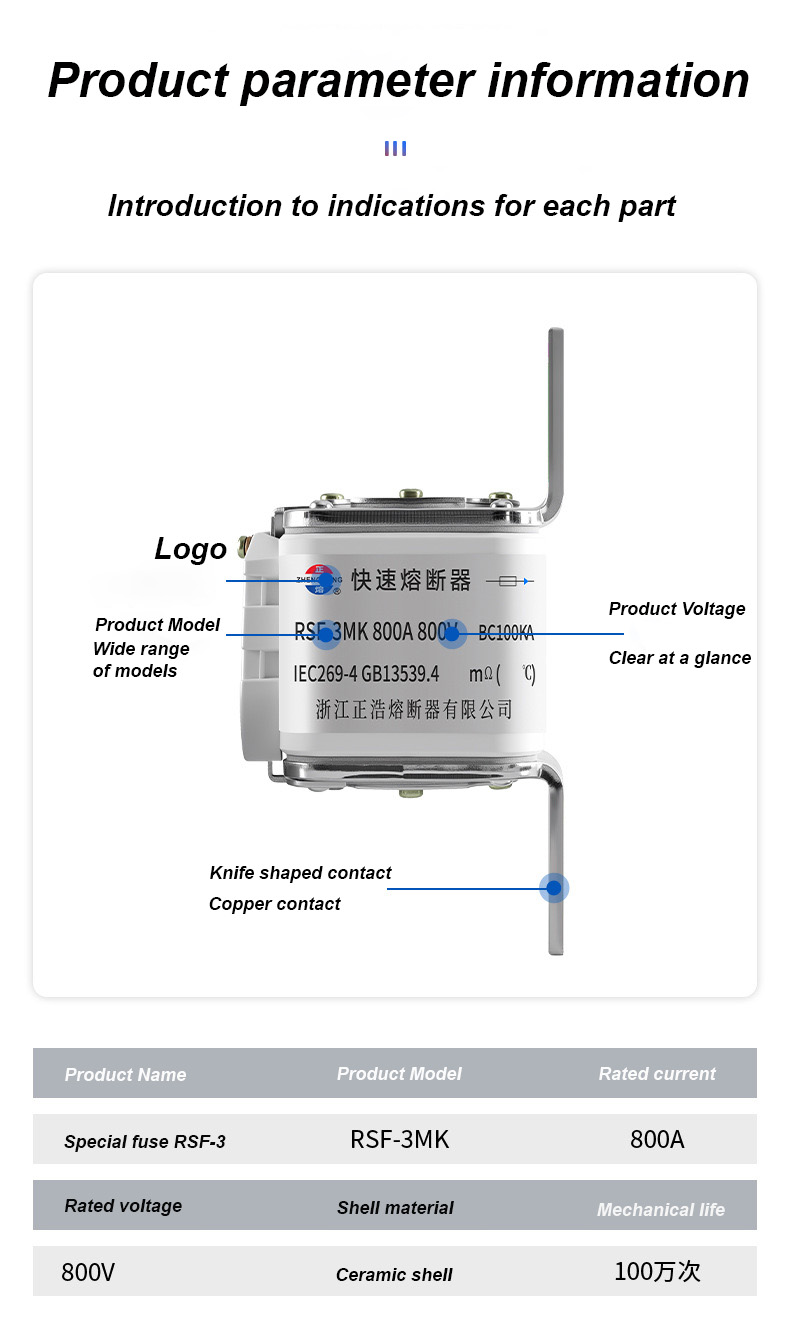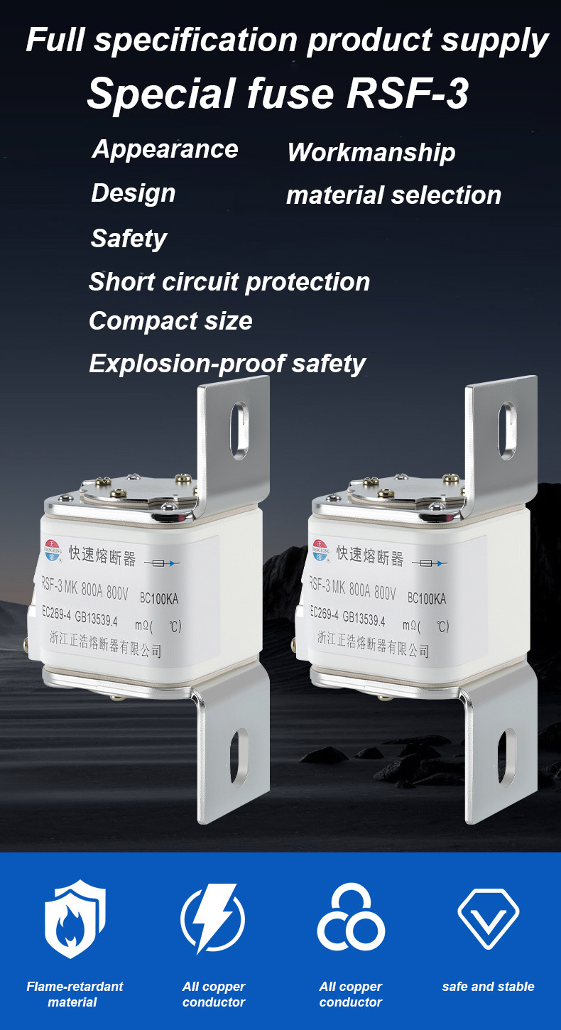 RSF-3MK 800V-800A BC100KA Fuse Links on tehokas teollisuuskatkaisin, joka sopii suuritehoisiin sähkösuojausskenaarioihin. RSF-3MK 800V-800A BC100KA sulake Linkit