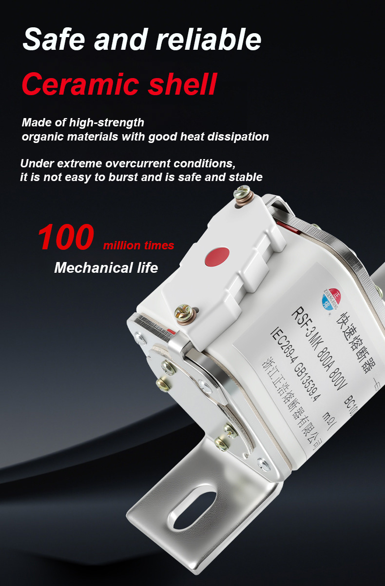sen nimellisjännite on 500 V ja nimellisvirta 315 A, mikä voi tehokkaasti varmistaa sähköturvallisuuden, estää ylikuormituksen ja oikosulun. RSF-3MK 800V-800A BC100KA sulake Linkit